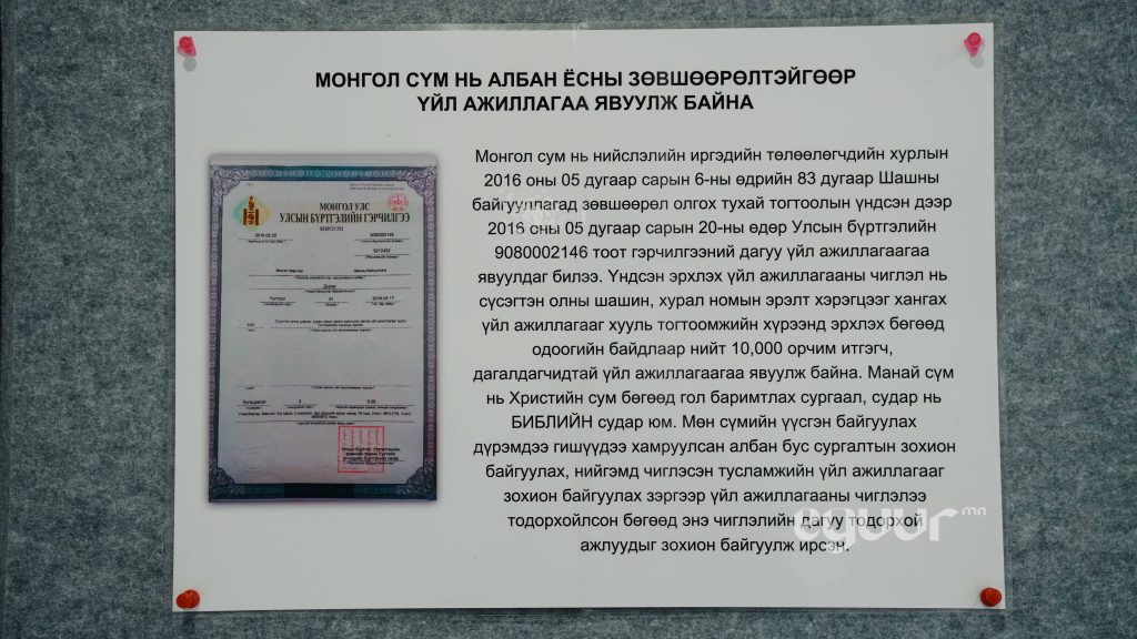 -Манайх албан ёсны зөвшөөрлөө 2016 онд авсан. Бид өөрсдийн гэсэн сүмтэй бол хаяг, байршлаа тавихад асуудал алга. Харин энэ байгууллагыг манайх түрээсэлж байгаа. Түрээслүүлэгч байгууллага анх гэрээ хийхдээ ямар нэг байдлаар гаднаа хаяг, загалмай байрлуулахгүй шүү гэж тохиролцсон юм.