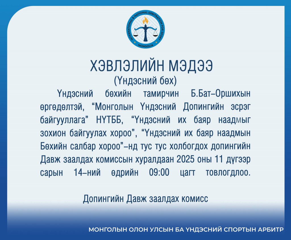 Тэгвэл аймгийн арслан Б.Бат-Орших энэ асуудлаар Арбитрын шүүхэд хандаж өргөдөл гаргаад байсан юм. Тус өргөдлийг Монголын олон улсын ба үндэсний спортын арбитр хүлээн авч энэ сарын 14-нд давж заалдах комиссын хуралдааныг товложээ. Хуралдаанд "Монголын Үндэсний допингийн эсрэг байгууллага" НҮТББ, "Үндэсний их баяр наадмыг зохион байгуулах хороо" болон "бөхийн салбар хороо"-ны төлөөллүүд оролцох аж.