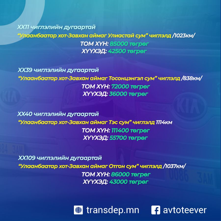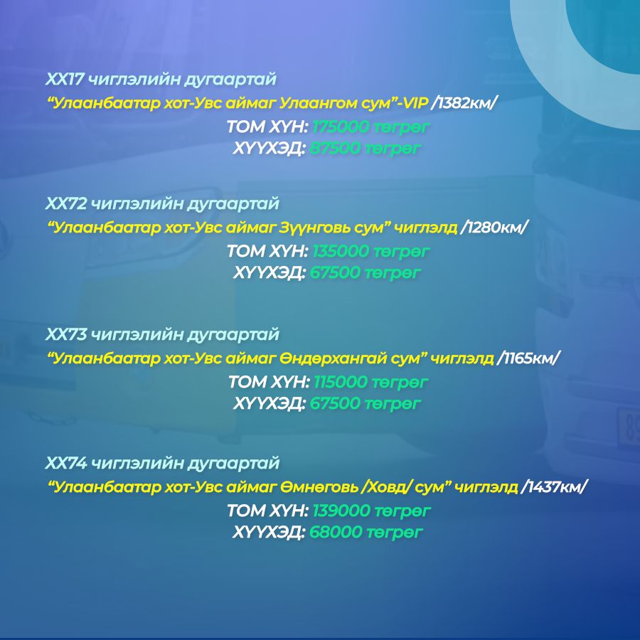 - ХХ19 чиглэлийн дугаартай “Улаанбаатар хот-Хөвсгөл аймгийн Мөрөн сум”,