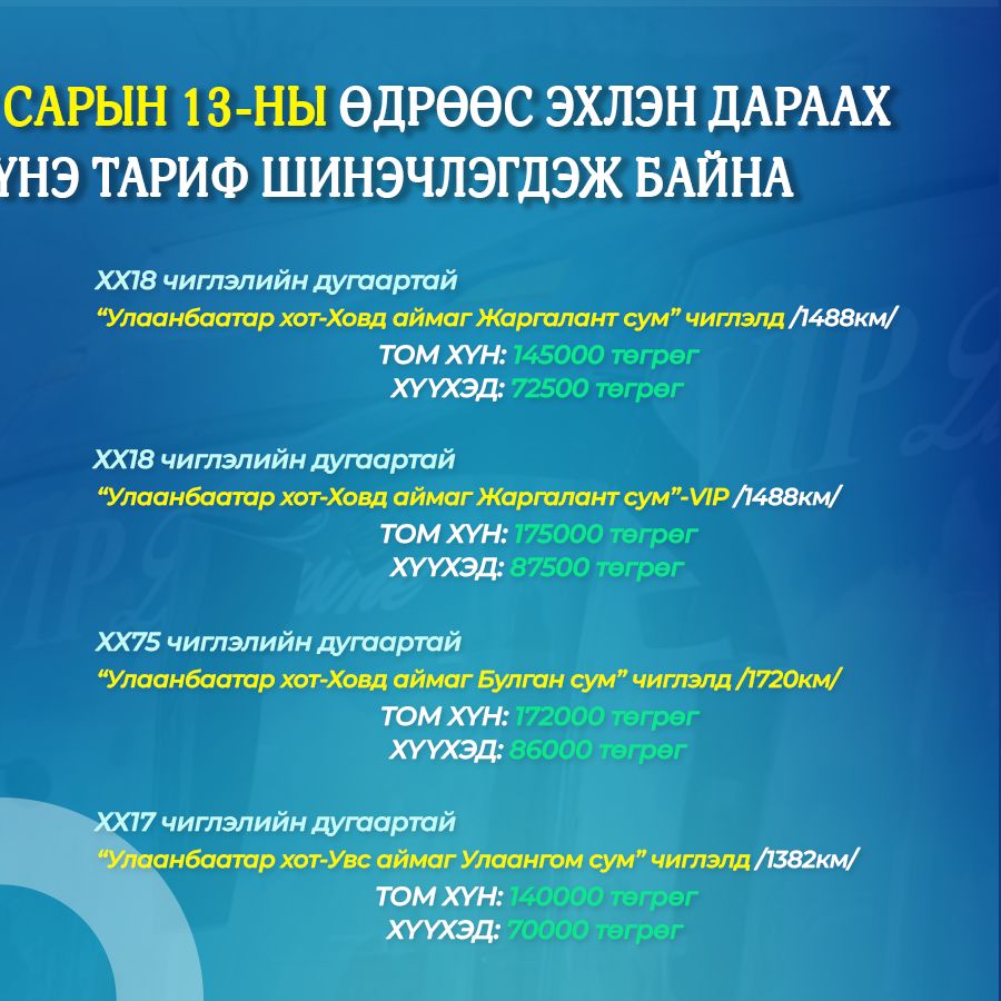 - ХХ56 чиглэлийн дугаартай Улаанбаатар хот Сэлэнгэ аймгийн Сүхбаатар сум” чиглэлүүдийн үйлчилгээний үнэ дараах байдлаар шинэчлэгдсэн байна.