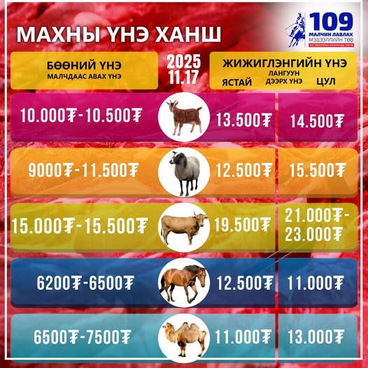 Хүнс, хөдөө аж ахуй, хөнгөн үйлдвэрийн яамны харьяа "109" Малчин лавлах мэдээллийн төвөөс өнөөдрийн байдлаар махны үнэ ханшийн мэдээллийг танилцууллаа. Тодруулбал үхрийн мах кг тутам нь хамгийн үнэтэй буюу жижиглэнгийн ястай махны үнэ 19500 төгрөг байгаа аж. Харин нэг кг үхрийн цул мах 21000-23000 төгрөгийн ханштай байгаа юм.