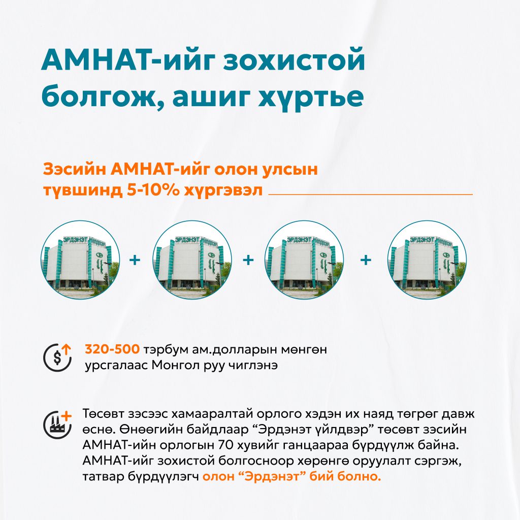 Харамсалтай нь “Эрдэнэт үйлдвэр” нийт борлуулалтын орлогынхоо 50 гаруй хувийг төсөвт татвар, хураамж хэлбэрээр төвлөрүүлж байгаагаас АМНАТ хамгийн том жин дарж байна. “Үндсэндээ шувтлуулж байна” гэж “Эрдэнэт үйлдвэр” ТӨҮГ-ын дарга Г.Ендон хэлсэн. Өөрөөр хэлбэл, 20 гаруй хувийн АМНАТ төлж байгаа учир үйлдвэрийг урт хугацаанд, тогтвортой ажиллуулахад шаардлагатай хөрөнгө оруулалтыг хийх мөнгө цаана нь үлдэхгүй байгаа аж.