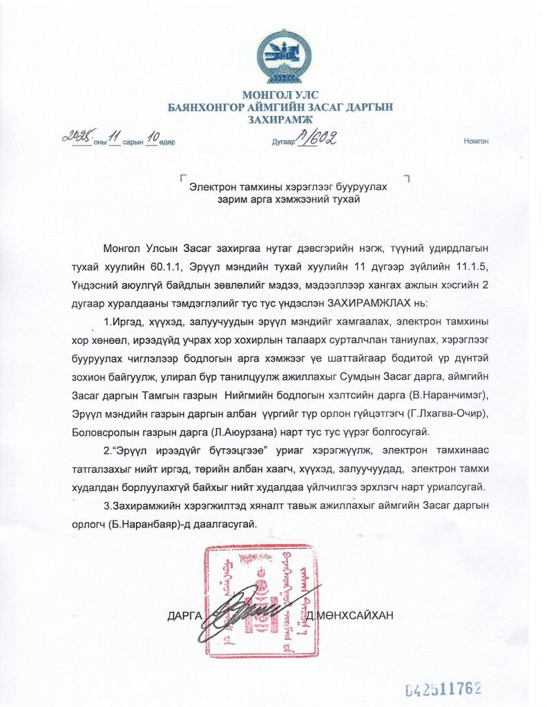 Тус захирамжид Монгол Улсын Засаг захиргаа нутаг дэвсгэрийн нэгж, түүний удирдлагын тухай хуулийн 60.1.1, Эрүүл мэндийн тухай хуулийн 11 дүгээр зүйлийн 11.1.5, Үндэсний аюулгүй байдлын зөвлөлийг мэдээ, мэдээллээр хангах ажлын хэсгийн 2 дугаар хуралдааны тэмдэглэлийг тус тус үндэслэжээ.