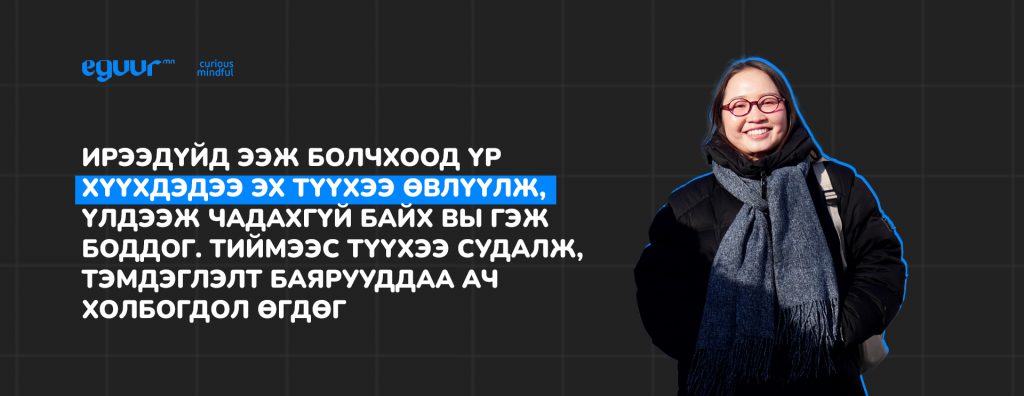 Бас би сүүлийн үед нэг зүйлээс их айгаад байгаа. Удахгүй ээж болох байх ээж болчхоод өөрөө түүх соёлоо мэдэхгүй бол үр хүүхдэдээ өвлүүлж, үлдээж чадахгүй юм шиг санагддаг. Цайны дээжээ өргөхөөс эхлээд манай улсад маш их соёл байдаг шүү дээ. Тэр бүхнээсээ алсраад байгаа юм шиг санагддаг. Тиймээс ийм жижигхэн өв уламжлалаа ч марталгүй илүү ойрхон байж, суралцахыг хичээж байгаа. Ээж болно гэх мэдрэмжийг мэдрэх тусам үр хүүхдэдээ өв уламжлал, түүх соёлоо үлдээх эрдэм мэдлэгтэйгээр төлөвших ёстой гэж бодогдож байна.