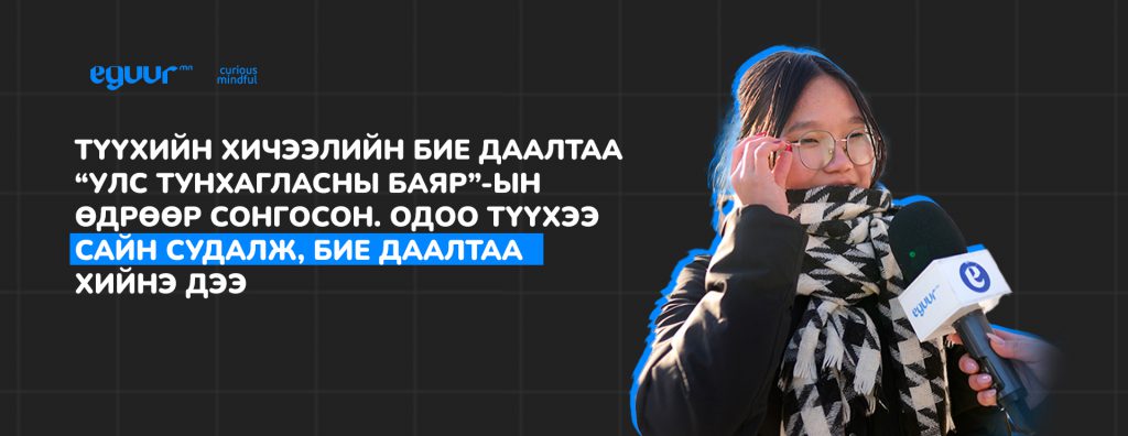 Түүхийн хичээлийн бие даалтаа “Улс тунхагласны баяр”-ын өдрөөр сонгосон. Одоо түүхээ сайн судалж, бие даалтаа хийнэ дээ. Ингэж илүү судалж, гүнзгий ухаж байж л түүхийн талаар сайн мэдлэгтэй болно гэж боддог.