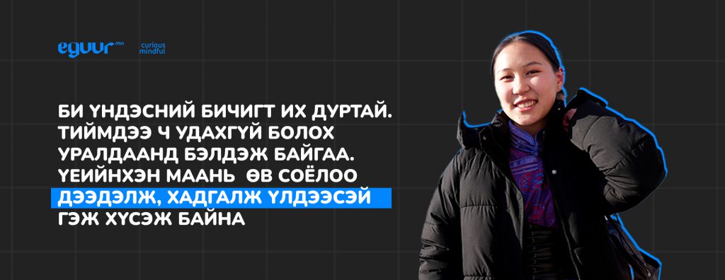 -Өв соёлоо эрхэмлэх өдөр гэж боддог. Би өөрөө үндэсний бичигт дуртай болохоор удахгүй болох тэмцээндээ оролцох гээд бэлдэж байна. Ер нь манай аав түүхийн талаар өөрийн мэддэг бүхнээ бид нарт ярих их дуртай. Байнга л эртний түүхийн талаар ярьж байдаг. Монгол бахархалын болон улс тунхагласны баярын өдрөөр амрах үедээ илүү их түүх хуучилдаг. Хуучны түүхийг сонсохоор бид энэ улсын газар нутгаа их дайнаас авч үлдсэн хүмүүс шүү дээ. Тиймдээ ч түүгээрээ их бахархаж, бахдах ёстой болов уу.