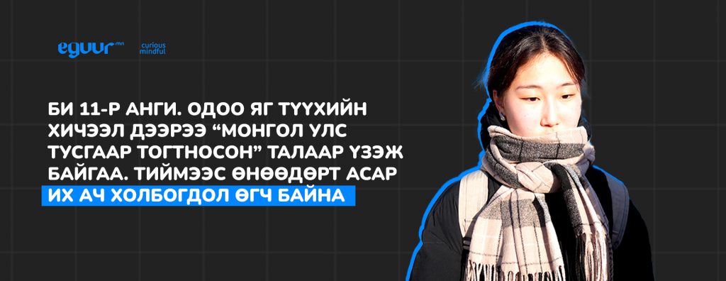 -Би 11-р ангид сурдаг. Одоо яг түүхийн хичээл дээрээ “Монгол улс тусгаар тогтносон” талаар үзэж байгаа. 1924 оны 11 дүгээр сарын 26-ны өдөр Монгол улс анхдугаар Үндсэн хуулиа баталж, Хаант засгаас Бүгд найрамдах засаглалд шилжиж, хамжлагат ёсыг халсан нь манай улсын түүхэнд тод үйл явдал болон хадгалагдсан. Тиймээс өнөөдөрт асар их ач холбогдол өгч байна. Харин үеийнхэндээ хандаж, түүхээ уншиж, судалдаг байгаарай гэж уриалмаар байна.