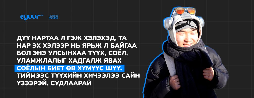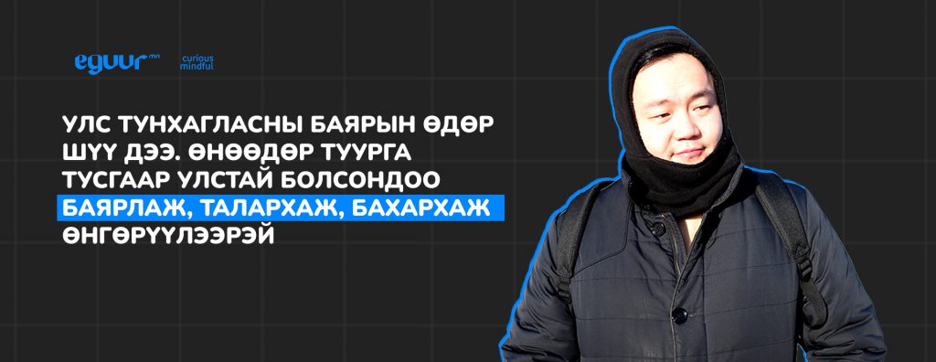 -Би бол нэлээн ач холбогдол өгдөг. Аль болох чадлаараа төрийн сүлд далбаандаа хүндэтгэлтэй ханддаг. Төв талбайгаараа ордог, төрийн ордны урд хэсэгт хэд хэдэн далбаа мандуулсан байгааг харах дуртай. Харин дүү нартаа л гэж хэлэхэд, та нар эх хэлээр нь ярьж л байгаа бол энэ улсынхаа түүх, соёл, уламжлалыг хадгалж явах соёлын биет өв хүмүүс шүү. Тиймээс түүхийн хичээлээ сайн үзээрэй, судлаарай. Энэ өдрүүд бол их ач холбогдолтой өдрүүд байдаг шүү.