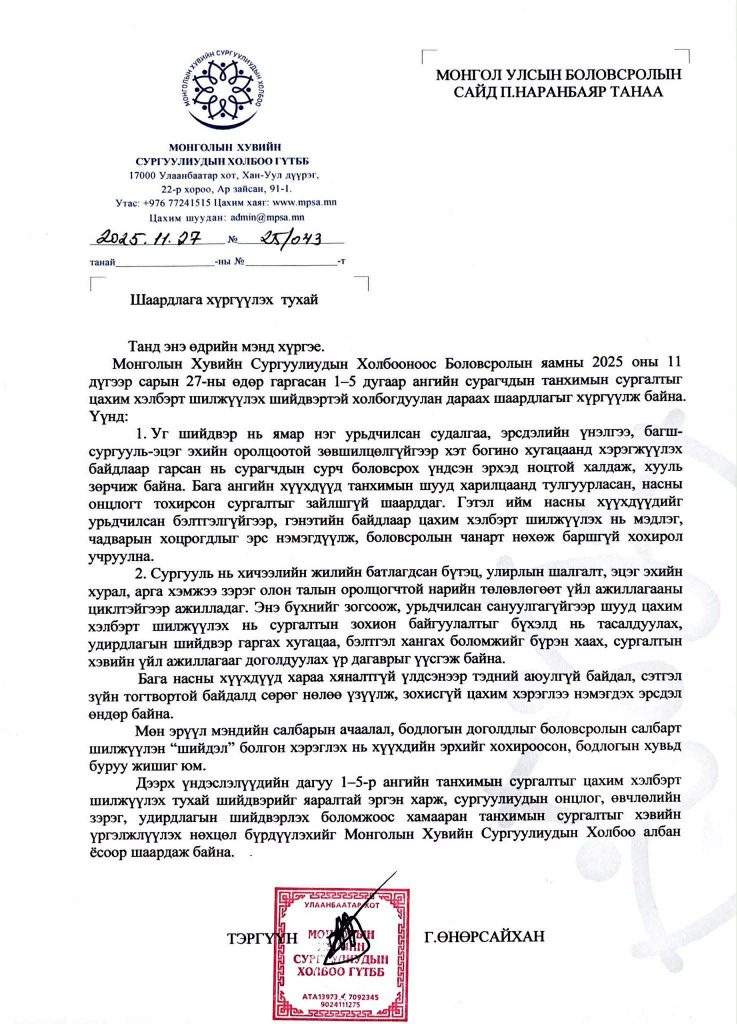 Тус шаардлагад, Монголын Хувийн Сургуулиудын Холбооноос Боловсролын яамны 2025 оны 11 дүгээр сарын 27-ны өдөр гаргасан 1-5 дугаар ангийн сурагдын танхимын сургалтыг цахим хэлбэрт шилжуулэх шийдвэртэй холбогдуулан дараах шаардлагыг хүргүүлж байна.