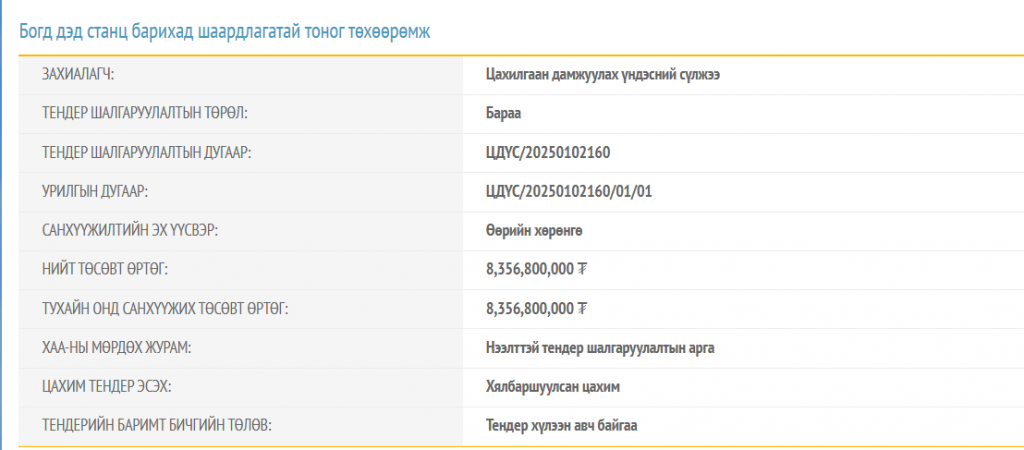 Тус тендерийг өнгөрсөн баасан гарагт буюу /2025-11-28/-ны өдөр зарласан бөгөөд материалыг энэ сарын 22-ны өдрийг дуустал хүлээн авахаар тусгажээ. Тус тендер дөрвөн багцтай. Багц болон түүний төсөвт өртгийг тодруулбал,
