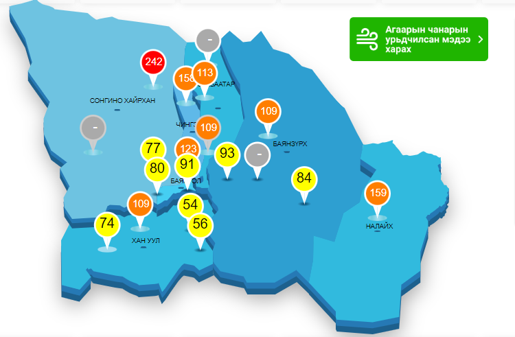 Өнөөдөр өглөөний байдлаар агаарын чанарын индексийг харвал, Баянхошуунд 242 бохирдолтой байна. Өчигдөр 13 цагийн орчимд Баянхошуунд 302 буюу хамгийн өндөр бохирдолтой гарсан билээ.