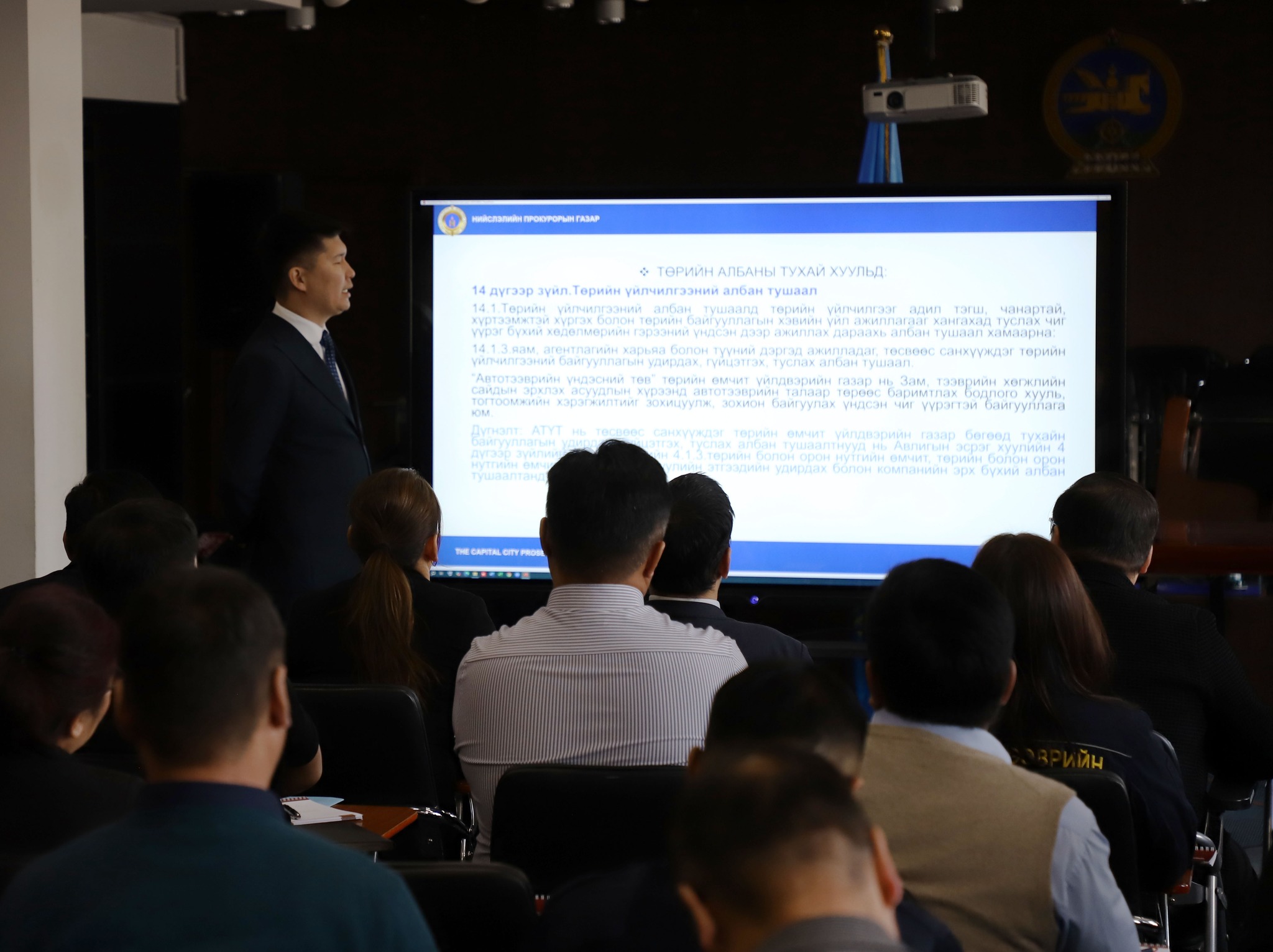 Нийслэлийн прокурорын газар, Авлигатай тэмцэх газрын Соён гэгээрүүлэх, урьдчилан сэргийлэх хэлтэс хамтран “Авлигын гэмт хэргийн тухай ойлголт”, “Авлига, ашиг сонирхлоос ангид байх нь” сэдэвт сургалтыг өнөөдөр зохион байгууллаа.