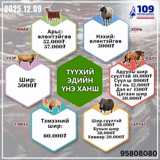 Тэгвэл Хүнс хөдөө, аж ахуй хөнгөн үйлдвэрийн яамнаас гаргасан энэ сарын 9-ны өдрийн байдлаарх малын түүхий эдийн үнийн мэдээллийг хүргэж байна.