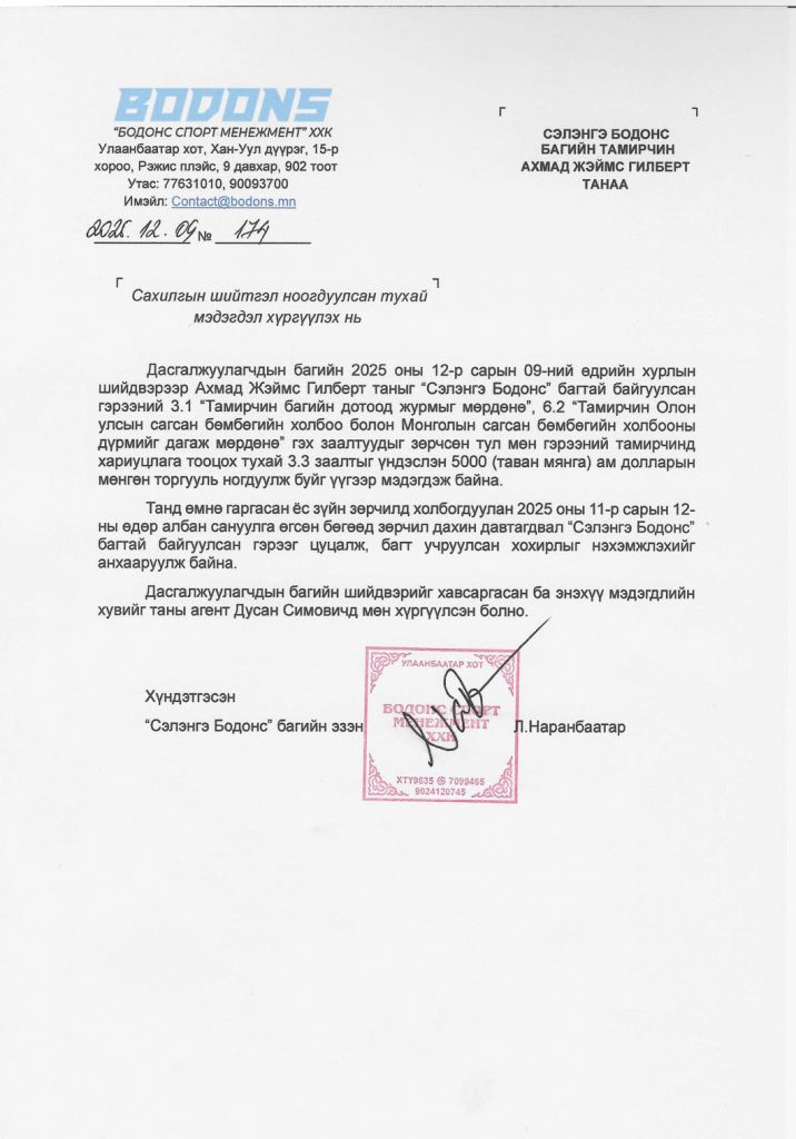 Түүнчлэн өмнө гаргасан ёс зүйн зөрчилд холбогдуулан 2025 оны 11-р сарын 12-ны өдөр албан сануулга өгсөн бөгөөд зөрчил дахин давтагдвал "Сэлэнгэ Бодонс" багтай байгуулсан гэрээг цуцалж, багт учруулсан хохирлыг нэхэмжлэхийг анхааруулжээ.