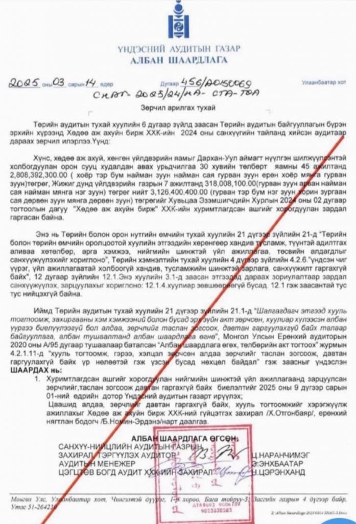 Тэдний энэхүү зөрчил бүр аудитын шалгалтын хүрээнд илэрч. Улмаар аудитын байгууллагаас зөрчлөө арилгах тухай албан шаардлага хүргүүлсэн байна. Зөрчлийг 2025.09.01-ний дотор арилгах үүрэг авчээ. Гэвч гурван сар өнгөрсөн ч, одоо хүртэл тоохгүй байгаа бололтой.