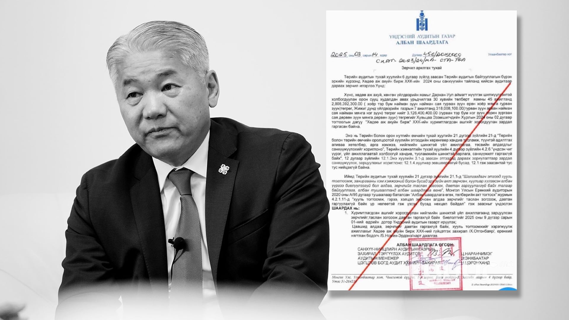 Зөрчил арилгах тухай гэсэн товч утгатай боловч шаардсан зүйл дотор нь зөрчлийг арилгах тухай дурдаагүй байна. Зүй нь тэдэн сарын тэдний дотор тэдэн тэрбум төгрөгийг тийм тоот дансанд хийж зөрчлийг арилгахыг Хэний буруу гэж тогтоосон юм тэр хүнд эсхүл хүмүүст үүрэг болгох байсан юм биш үү. Таслан зогсоох нь гэдэг үйлдээ үргэлжүүлэхээ боль гэсэн агуулгатай, дахин гаргахгүй гэдэг чинь цаашидл гэсэн агуулгатай тэгэхээр энд зөрчил арилгах тухай угаасаа дурдаагүй байна. Ийм л өөх ч биш булчирхай ч биш юм санаатай санамсаргүй хийгээд байгаа юм даа. Зүй нь одоо Үндэсний аудитын Ерөнхий аудитор энэ аудит хийсэн багийн ахлагч, албан шаардлага хүргүүлсэн аудиторт хариуцлага эхлээд тооцох хэрэгтэй юм биш үү. Дараа нь энэ асуудлаар дахин баг оруулж зөв дүгнэлтийг гаргах нь зүйтэй болов уу Та бүхэн юу гэж бодож байна.