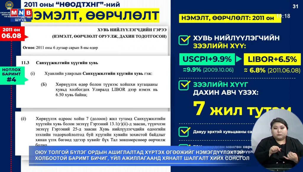 Өнөөдрийн сэдэв: “Оюу толгой” ХХК-ийн Хувь нийлүүлэгчдийн гэрээ /Нэмэлт, өөрчлөлт оруулж, дахин тодотгосон/-ний санхүүжилтийн хүүгийн хувь, түүнийг олон улсын зах зээлийн жишигт нийцүүлэн бууруулах талаар авч хэрэгжүүлсэн арга хэмжээ, холбогдох үр дагавар (үргэлжлэл)" .