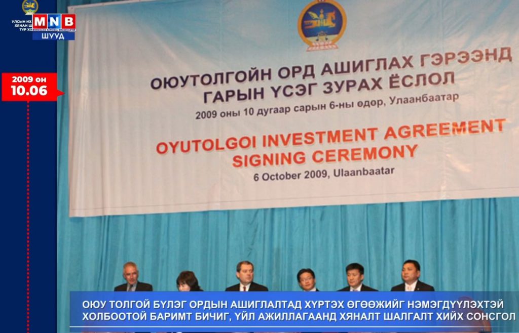 Ерөнхий сайд асан С.Баяр, "Сайн байцгаана уу. Надад хэдэн минут байгаа юм. Өгөөж гэдэг бол гол асуудал. Бидний хувьд тухайн үед Хөрөнгө оруулалтын гэрээ, Хувь нийлүүлэгчдийн гэрээг боловсруулсан. ТЭЗҮ тухайн үед бэлэн болоогүй байсан. Хэлэлцэн тохиролцсон асуудлын үр дүнд ТЭЗҮ-д өөрчлөлт ороод цааш явах байсан учир. 2009.10.06-нд баталсан боловч тодорхой нөхцөлүүдийг хангасны дараа гэрээ хүчин төгөлдөр болно гэсэн урьдчилсан нөхцөлтэй байсан. Дараа оны буюу 2010.03.31-нээс төгөлдөр болсон юм аа.