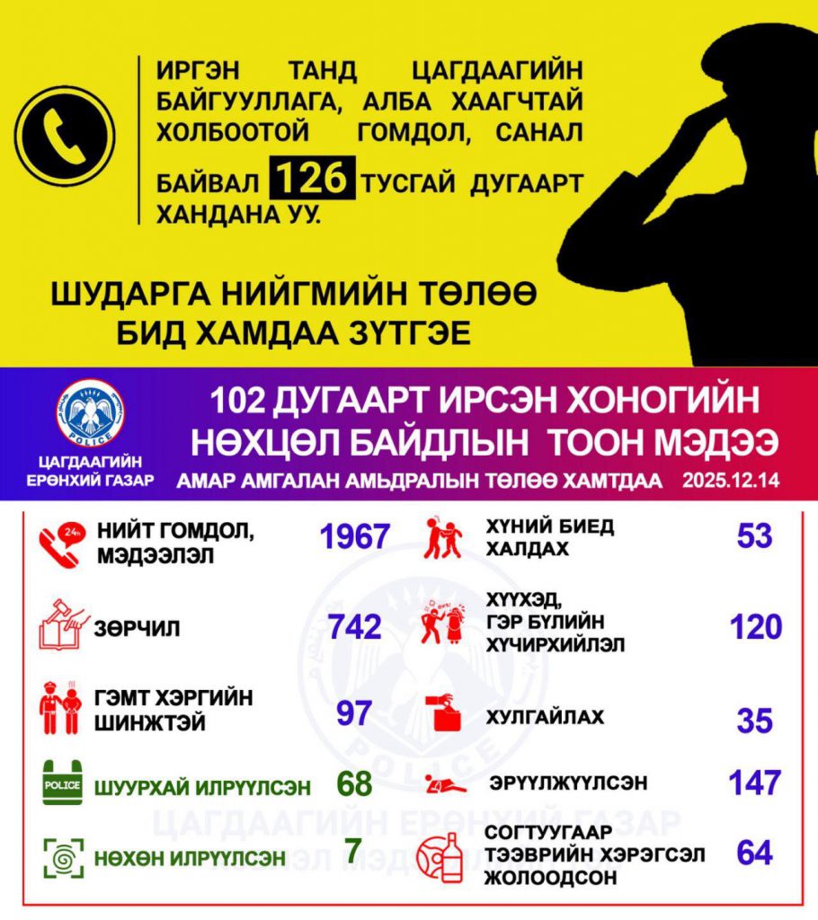 Өнгөрсөн хоногт буюу энэ сарын 14-ний өдөр Цагдаагийн байгууллагын 102 тусгай дугаарт 1967 дуудлага, мэдээлэл бүртгэгджээ. Тодруулбал, зөрчлийн шинжтэй 742, гэмт хэргийн шинжтэй 97 дуудлага, мэдээлэл ирсэн байна.