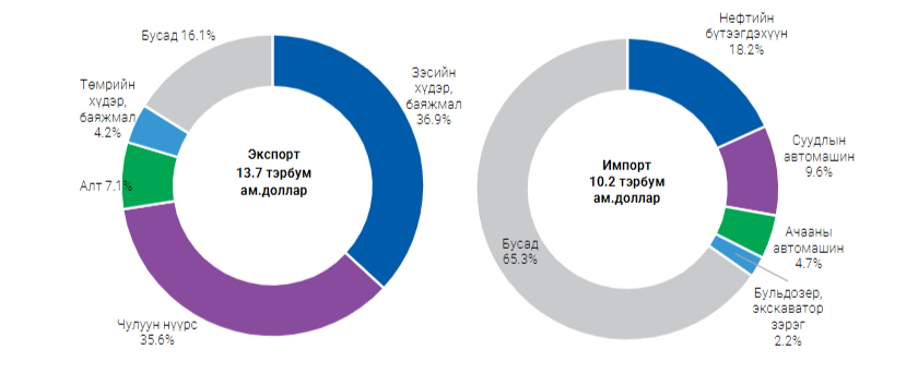 Үүнээс экспорт 13.7 тэрбум ам.доллар, импорт 10.2 тэрбум ам.доллар болж, тэнцэл 3.5 тэрбум ам.долларын ашигтай гарчээ.