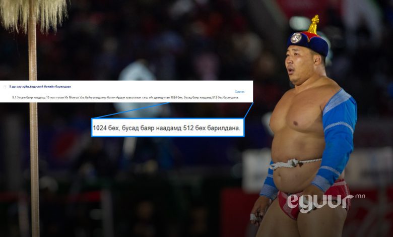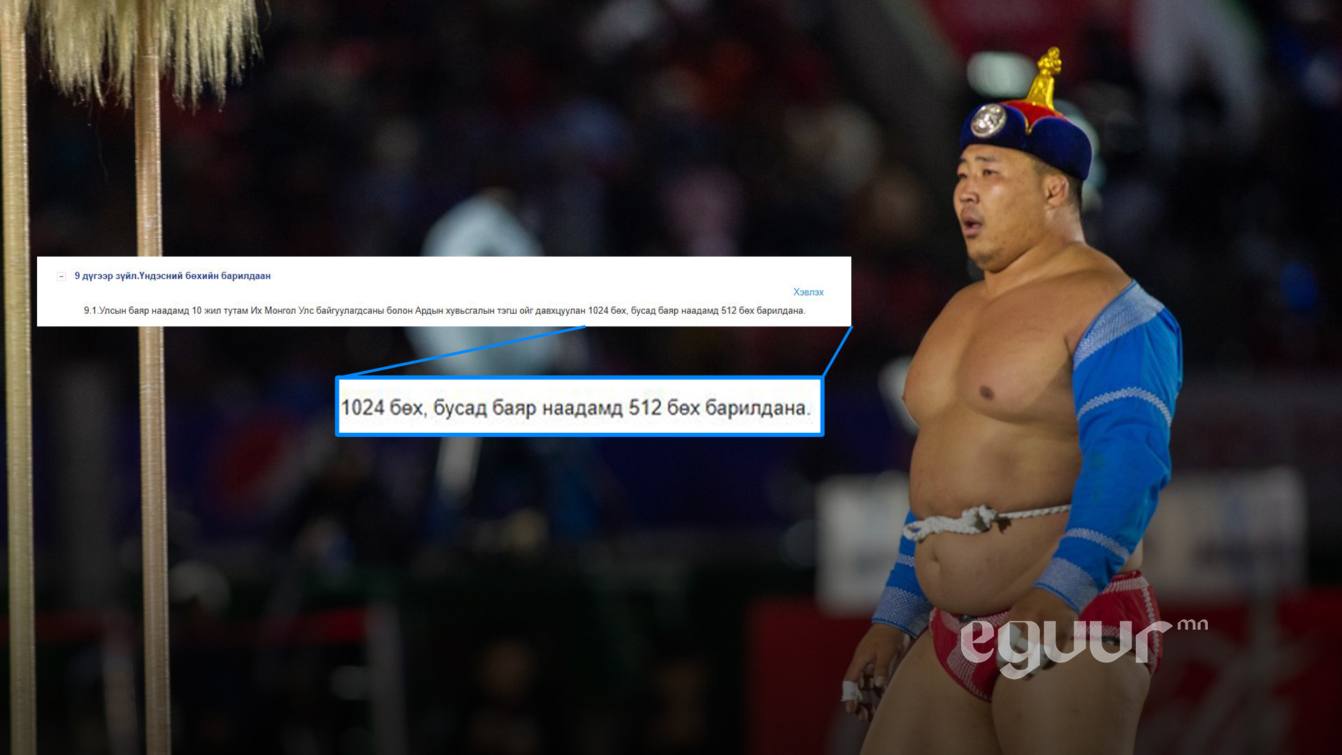 Үндэсний их баяр наадмын тухай хуулийн 9-р зүйлийн 9.1-т "Улсын баяр наадамд 10 жил тутам Их Монгол Улс байгуулагдсаны болон Ардын хувьсгалын тэгш ойг давхцуулан 1024 бөх, бусад баяр наадамд 512 бөх барилдана" гэж заажээ. Тэгвэл энэ жил Их Монгол Улс байгуулагдсаны 820 жил, Ардын хувьсгалын 105 жилийн ой тохиож байгаа тул 1024 бөх барилдахгүй. Учир нь энэ жил ганц тэгш ой тохиож байна.