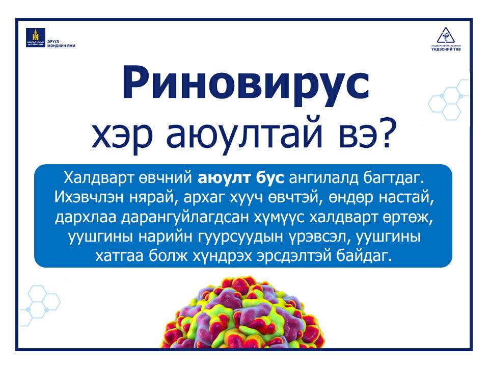 Тэрчлэн дэлхий дахинд төдийгүй манай улсын хүн амын дунд жил бүр энэ төрлийн өвчлөл үүсдэг аж. Сүүлийн өдрүүдэд улсын хэмжээнд эрс хүйтэрч байгаа бөгөөд тус хүйтэн энэ сарын 21-ныг хүртэл үргэлжилнэ гэж Цаг уурын байгууллагаас мэдээлээд буй. Тэгвэл энэ үеэр даарч дархлаа нь суларсан иргэд риновирусээр өвчлөх магадлалтай юм.
