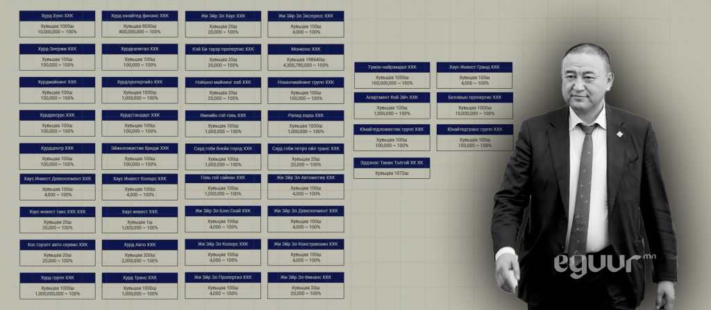 Нэрлэвэл, Хурд Хүнс ХХК, Хурд Авто ХХК, Хурд групп ХХК, Рапид харш ХХК, Хаус инвест ХХК, Сауд гоби блейк гоулд ХХК, Апартмент Кей Эйч ХХК, Говь гоё сайхан ХХК, Өмнийн гоё говь ХХК, Хурд Транс ХХК, Хурдпропертийз ХХК, Эйжнложистик бридж ХХК, Юнайтедтранс групп ХХК, Хурдресурс ХХК, Хурдцентр ХХК, Юнайтедложистик групп ХХК, Хурдстандарт ХХК, Хурдмайнинг ХХК, Хурдкапитал ХХК, Хурд-Энержи ХХК, Нэшнлмайнинг групп ХХК, Монконс ХХК, Беллвью пропертис ХХК, Түмэн найрамдал ХХК, Хурд юнайтед финанс ХХК, Нэйшнл майнинг лаб ХХК, Хаус инвест такс ХХК ХХК, Кэй Би тауэр пропертис ХХК ХХК, Сауд гоби петро ойл транс ХХК ХХК, Хос гэрэлт авто сервис ХХК ХХК, Жи Эйр Эл Хаус ХХК ХХК, Жи Эйр Эл Финанс ХХК ХХК, Хаус Инвест Девелопмент ХХК ХХК, Жи Эйр Эл Блю Скай ХХК ХХК, Жи Эйр Эл Автомотив ХХК ХХК, Жи Эйр Эл Экспресс ХХК ХХК, Жи Эйр Эл Констракшин ХХК ХХК, Жи Эйр Эл Девелопмент ХХК ХХК, Хаус Инвест Гранд ХХК ХХК, Хаус Инвест Колорс ХХК, Жи Эйр Эл Пропертиз ХХК, Жи Эйр Эл Колорс ХХК