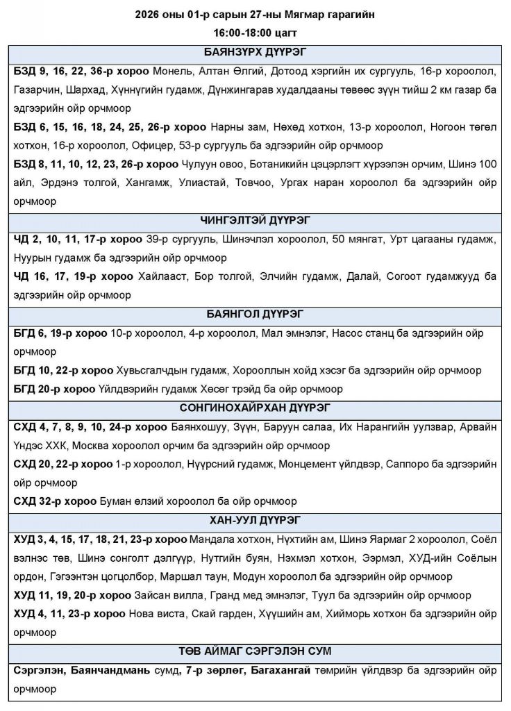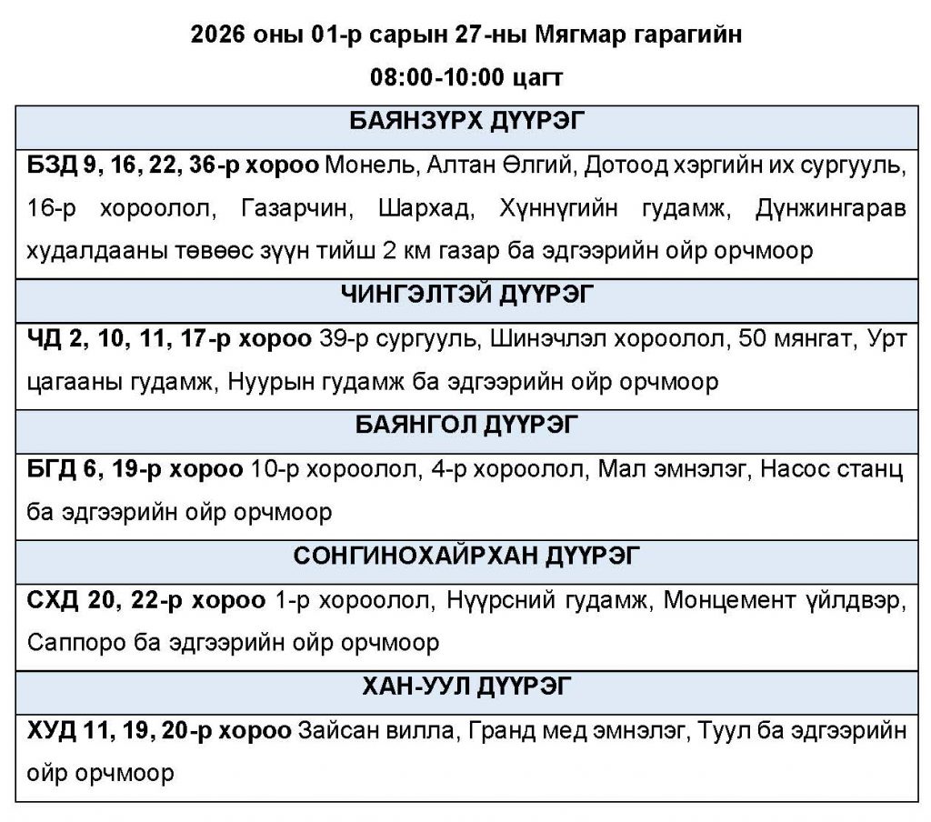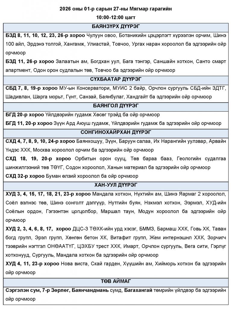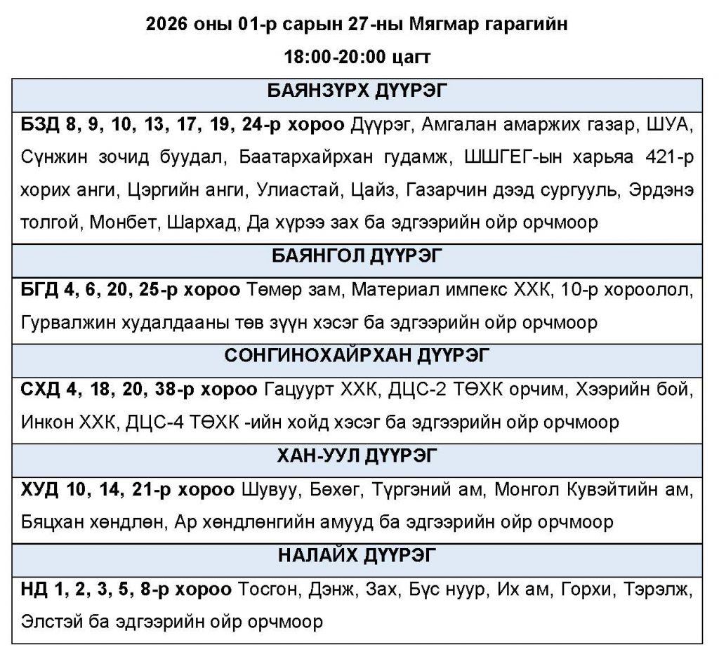 Өнөөдөр буюу 2026 оны нэгдүгээр сарын 27-ны мягмар гарагт цахилгаан эрчим хүчний цахилгаан хязгаарлах байршлуудын хуваарийг хүргэж байна. Эрчим хүчний системд аваарын горим үүсэхээс сэргийлэн нэгдсэн сүлжээнд холбогддог тодорхой байршлуудад цахилгаан эрчим хүчний төлөвлөсөн хэрэглээг “Диспетчерийн үндэсний төв” ТӨХХК-ийн шийдвэрээр хуваарийн дагуу 2 цагийн хугацаатайгаар хязгаарлах арга хэмжээ авч байгаа аж.