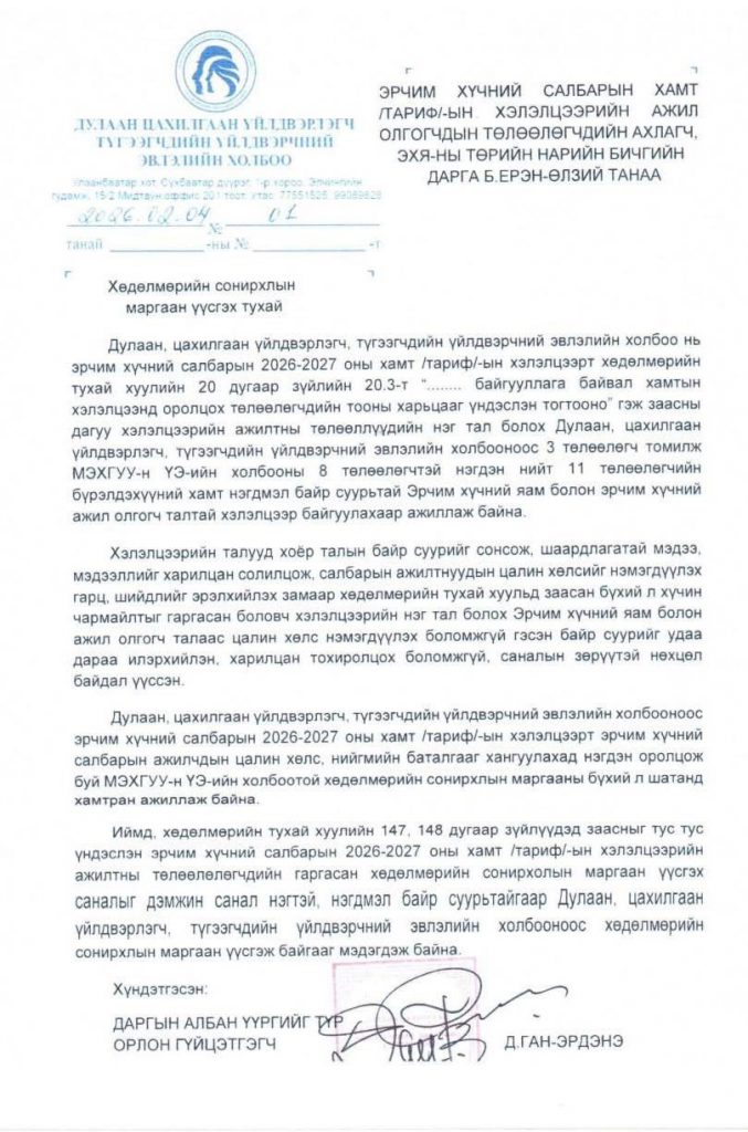 "Дулаан цахилгаан үйлдвэрлэгч, түгээгчдийн үйлдвэрчний эвлэлийн холбоо"-ноос 2026-2027 оны тарифын хэлэлцээрт эрчим хүчний салбарын ажилчдын цалин, хөлсийг 30-аас доошгүй хувиар нэмэгдүүлэх саналыг гаргажээ.