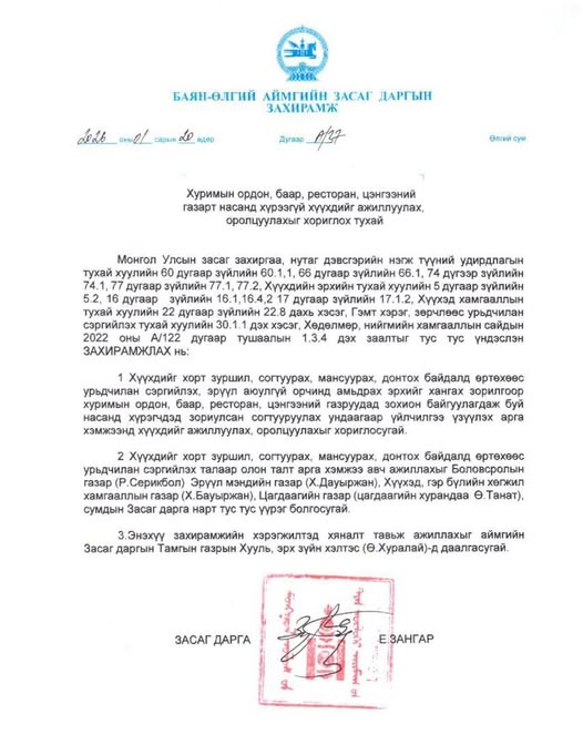 Хуримын ордон, баар, ресторан, цэнгээний газруудад насанд хүрээгүй хүүхдийг ажиллуулах, оролцуулахыг хоригложээ. Тодруулбал, аймгийн засаг дарга Е.Зангар хүүхдийг хорт зуршил, согтуурах, мансуурах, донтох байдалд өртөхөөс урьдчилан сэргийлэх, эрүүл аюулгүй орчинд амьдрах эрхийг хангах зорилгоор дээрх захирамжийг гаргажээ.