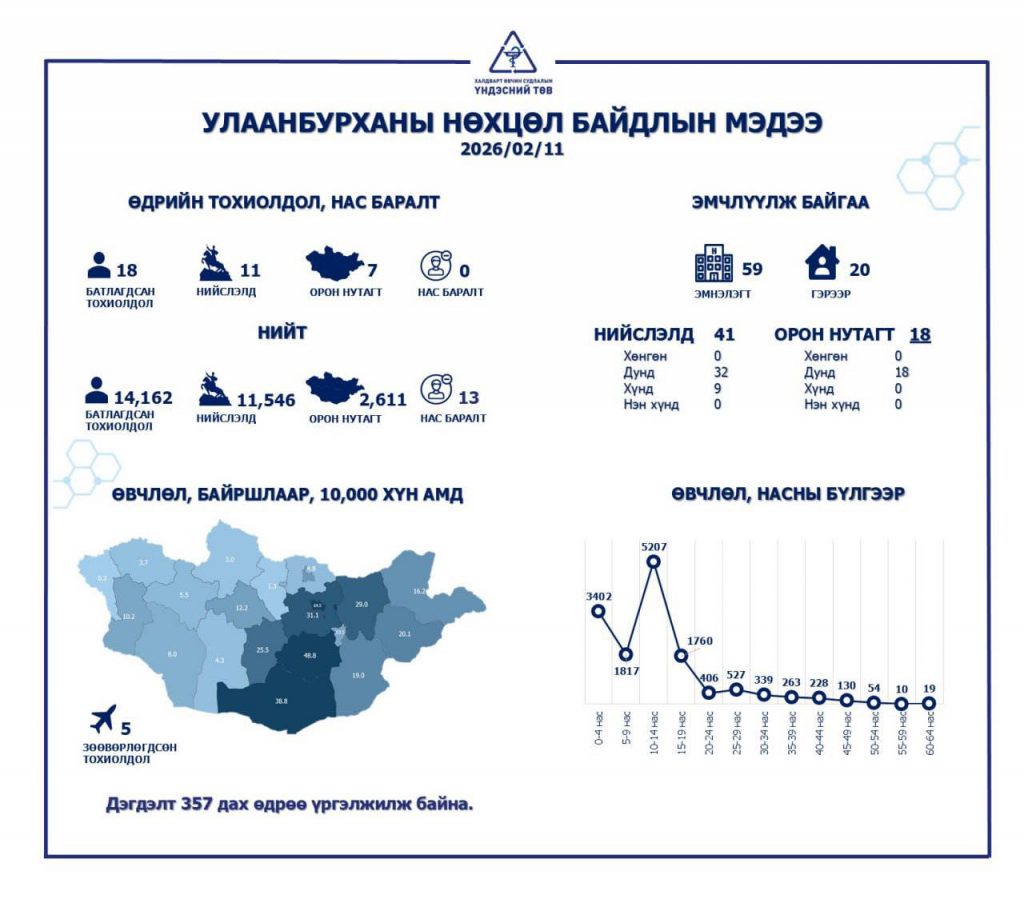 Халдварт өвчин судлалын үндэсний төвөөс улаанбурхан өвчний нөхцөл байдлын талаарх мэдээллийг өглөө. Тус өвчний дэгдэлт 357 дах өдрөө үргэлжилж байгаа бөгөөд шинээр 18 тохиолдол батлагдсан байна. Үүний 11 нь нийслэлд, долоо нь орон нутагт бүртгэгджээ. Улмаар нийт батлагдсан тохиолдол 14,162 боллоо.