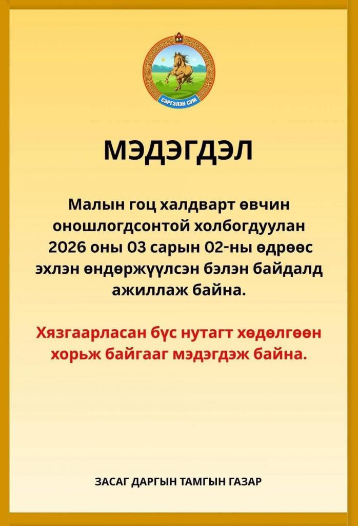 Төв аймгийн Сэргэлэн суманд малын гоц халдварт өвчин гарч, өндөржүүлсэн бэлэн байдал өчигдөр /2026.03.02/ зарласан байна. Түүнчлэн хөдөлгөөн хорьсон талаараа Засаг даргын тамгын газраас мэдээлсэн.