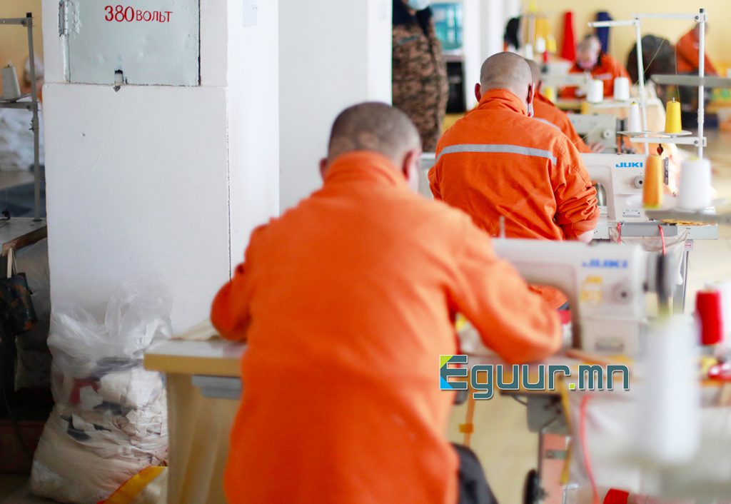 Эхлээд бид 427 дугаар хаалттай хорих ангийн хаалттай энгийн зэрэглэлтэй байранд оров. Нэхий, даавуун бүтээгдэхүүний цех рүү ороход 10-аад хоригдол толгой өөд татах сөхөөгүй юм оёж суув. Тэд хантааз, өвдгөвч, тохойвч, аяны мишок, хүүхдийн нэхий өлгийнөөс авхуулаад 23 төрлийн бүтээгдэхүүн оёдог юм байна.
