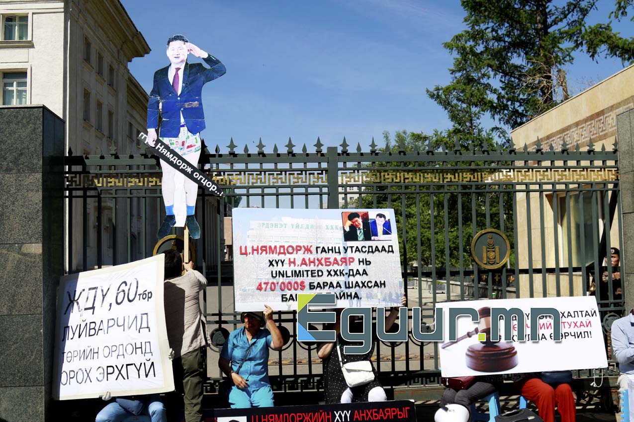 Тэд Ц.Нямдоржийн хүү Н.Анхбаярыг Элчин сайд болохыг эсэргүүцсэн, ард түмэнд халтай зөрчлийн хууль баталсан зэрэг уриа лоозон барьсан байх бөгөөд шүгэл үлээн, бөмбөр нүдэж, цагаан хоолойгоор Ц.Нямдорж сайдыг огцрохыг шаардсан бичгээ уншиж байна.