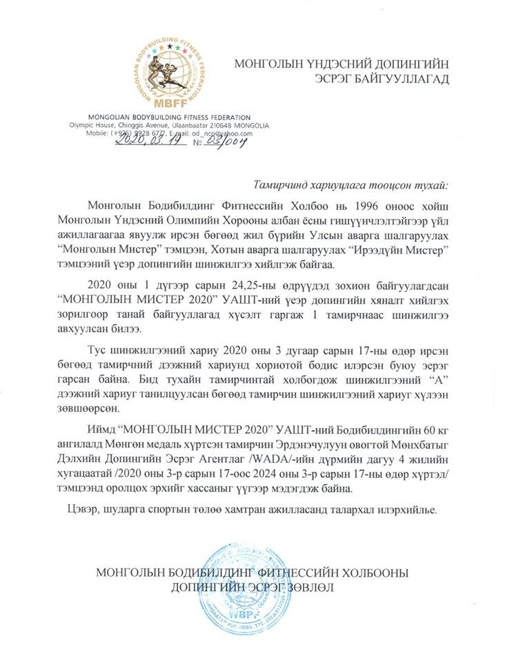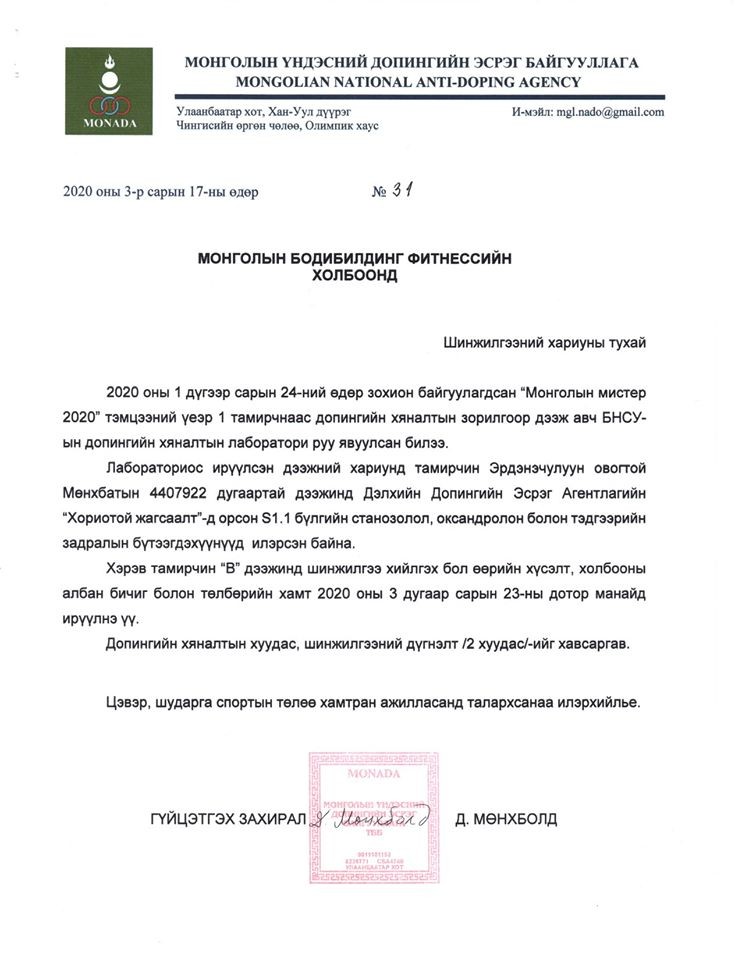 Энэ оны нэгдүгээр сарын 24-25-нд болсон бодибилдинг, фитнессийн “Монголын мистер-2020” тэмцээний бодибилдингийн 60 кг-д мөнгөн медаль хүртсэн Эрдэнэчулууны Мөнхбатаас допинг илэрчээ.