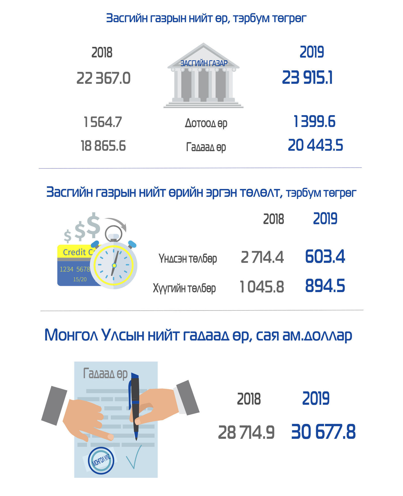 Засгийн газрын нийт өр 2019 онд 23.9 их наяд төгрөг болж, өмнөх оноос 1.5 их наяд төгрөг ба 6.9%-аар нэмэгдсэн байна.