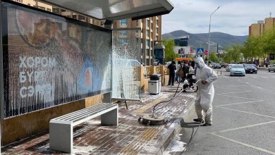 Автобусны буудлын сандал, хогийн сав болон ТҮЦ-үүдийг халдваргүйтгэлийн бодисоор цэвэрлэж байна