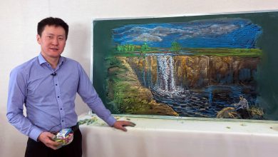 Б.Бямбаа багш Орхоны хүрхрээг гурван өнгийн шохойгоор зуржээ
